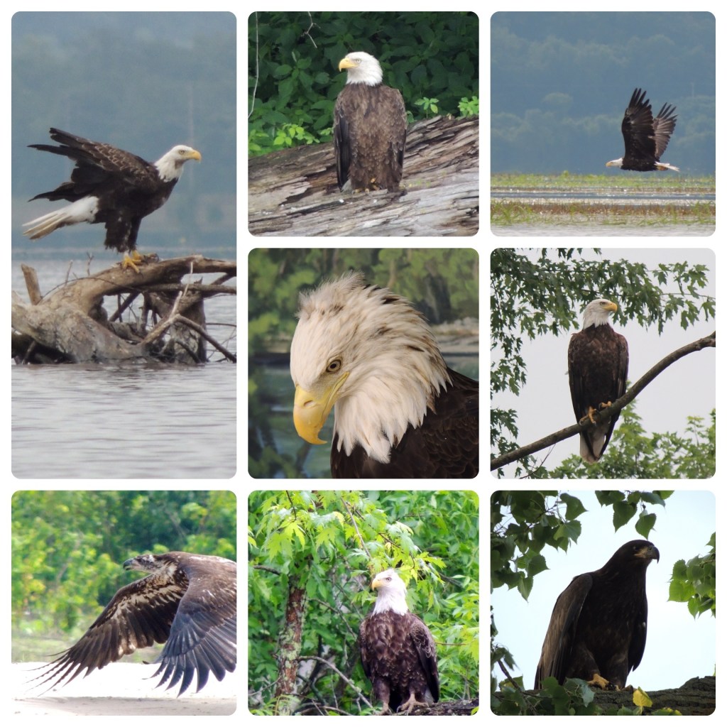 As we paddled the Mississippi, we were comforted by the number of bald eagles we witnessed, especially in the states of Minnesota, Wisconsin and Iowa. Each eagle sighting was awe-inspiring: in trees along the river, soaring on air currents, watching us from on high at a campground, skimming the surface of the water, or standing on a stump in the shallows, searching for a meal (as in the case of my poem, “Stump Field Fishing”).